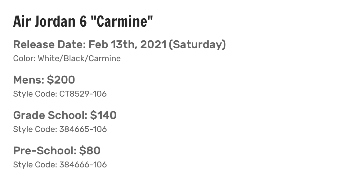 나이키 에어 조던 6 카마인 출시 날짜 가격 정보